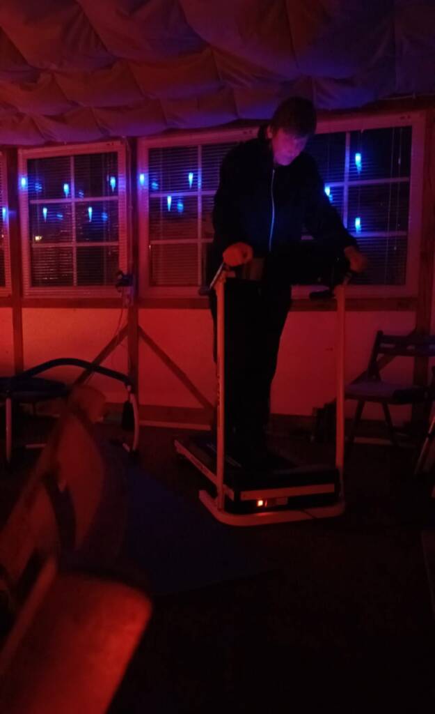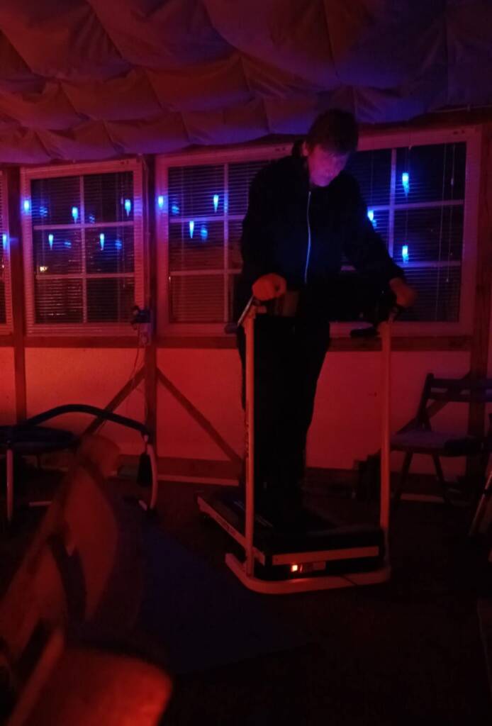 Auf Laufband eine Steigerung und das Pferd an Longe